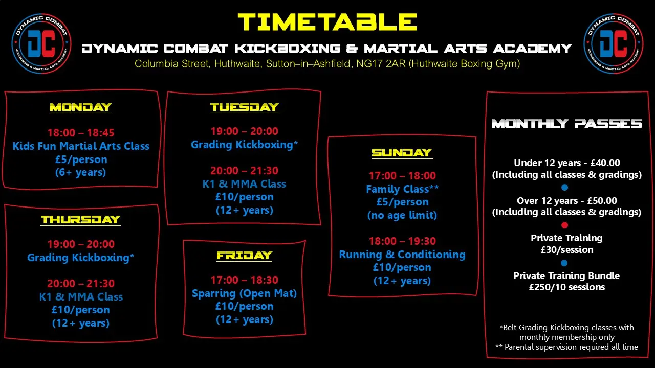 Kid's fun martial class 18:00 - 18:45 β | Belt Grading Kickboxing 19:00 - 20:00 β K-1 & MMA 20:00 - 21:30 β | Belt Grading Kickboxing 19:00 - 20:00 β K-1 & MMA 20:00 - 21:30 β | Sparring & Open Mat 17:00 - 18:30 β | Family Kickboxing 17:00 - 18:00 β Running & Conditioning 18:00 - 19:30 β |
